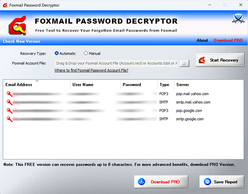 | Now it can recover passwords from Foxmail v7.x. Supports manual & automatic mode of password recovery. Quick Drag & Drop of foxmail account file. |