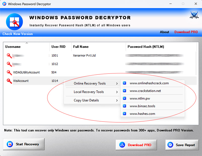 Windows Password Decryptor is the FREE software to instantly recover login password hash (NTLM) of all Windows user accounts.